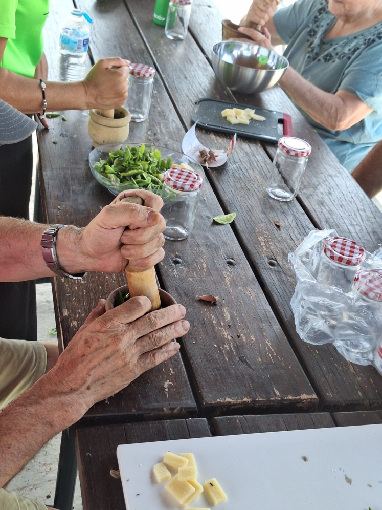 - Elaboración de pesto con ingredientes recolectados, conectando cultivo, cocina y salud.